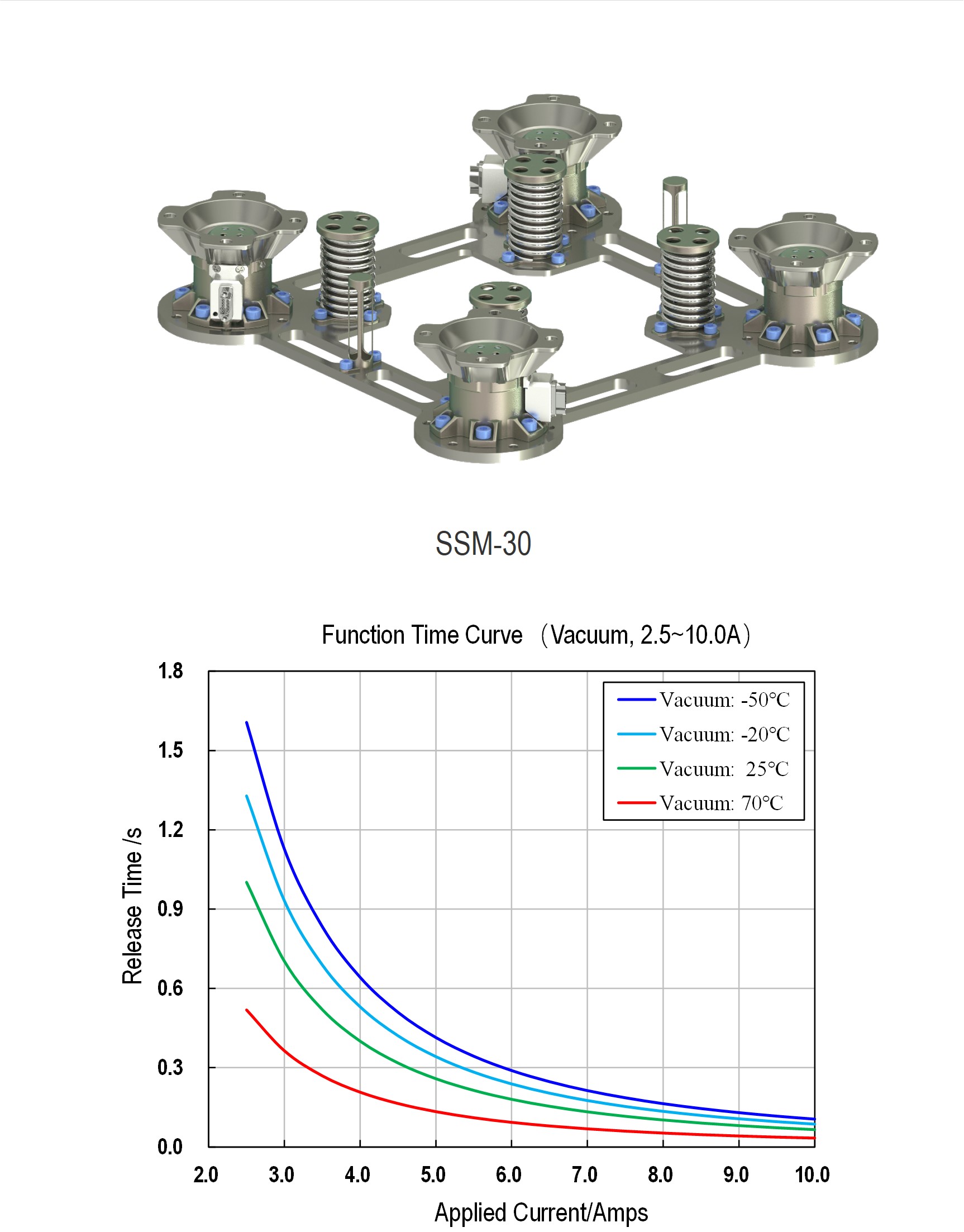 Compared with the conventional explosive bolt based four-point separation mechanism or clamp-band separation mechanism, the SSM separation mechanism shows the advantages of low shock, reusability, simple mechanical interface, easy to transportation and operation.